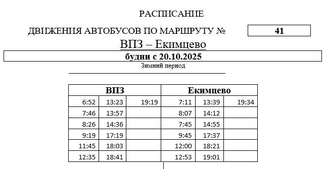 С 20 октября 2025 года маршрут № 41 «ВПЗ - Екимцево» возобновляет работу по рабочим дням.