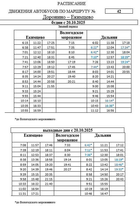 С 20 октября 2025 года маршрут № 42 «Дальняя - Екимцево» переходит на зимний период, конечным остановочным пунктом будет «Дальняя».