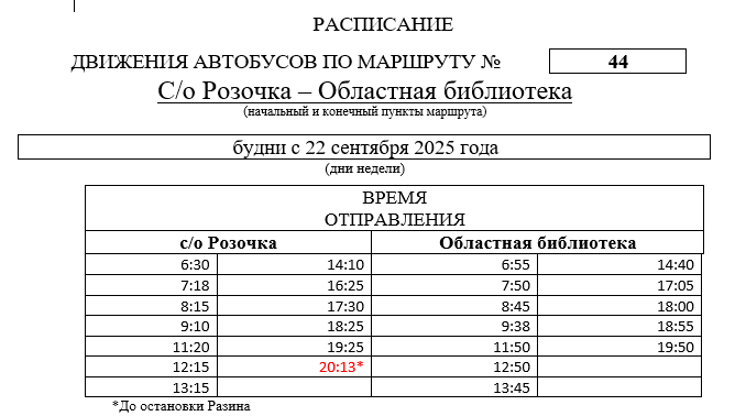 С 22 сентября 2025 года в расписание движения автобусов по рабочим дням на маршруте № 44 «Областная библиотека – с/о Розочка» будут внесены изменения: